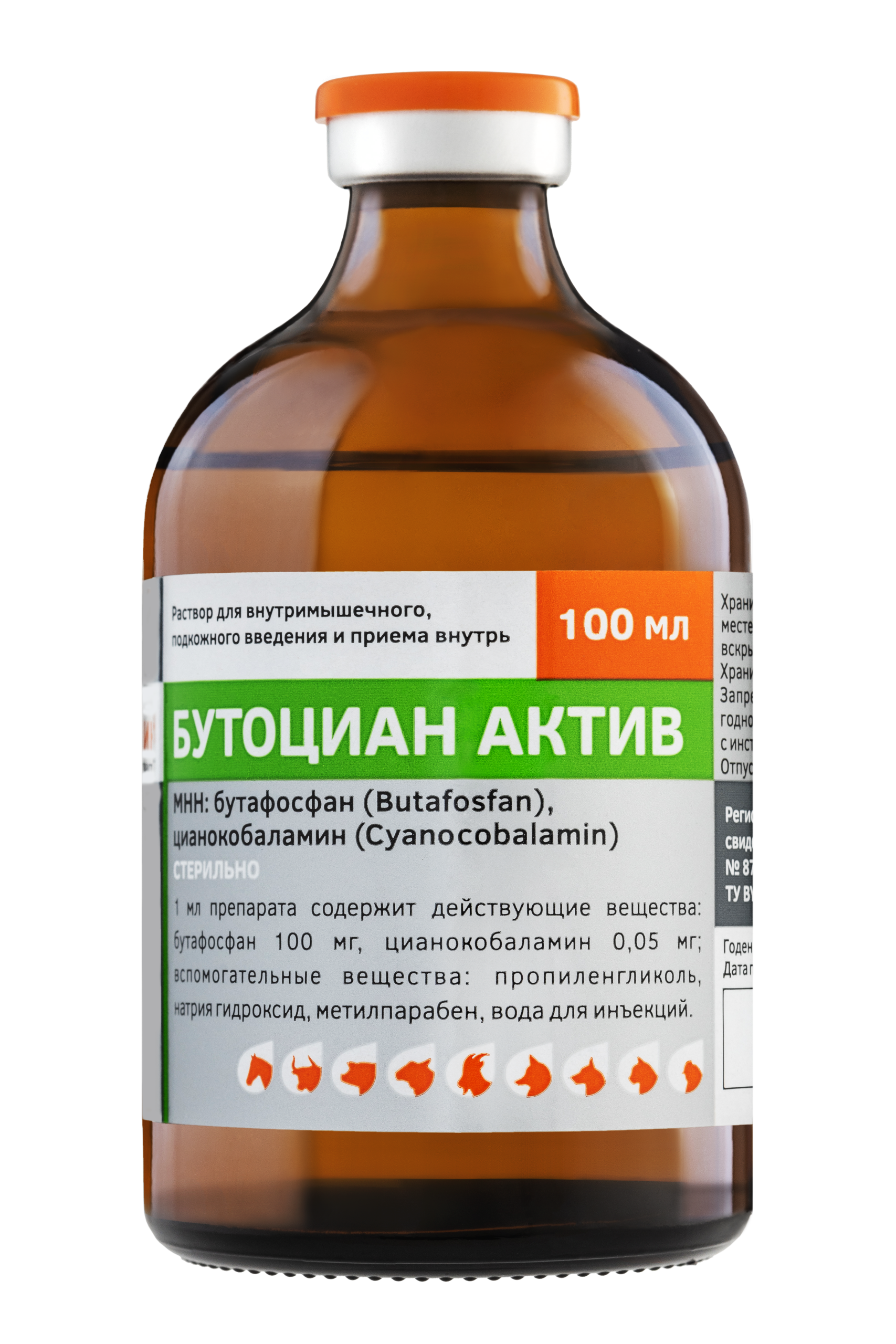 1 см3 препарата содержит действующие вещества: бутафосфан 100 мг, цианокобаламин 0,05 мг, вспомогательные вещества.