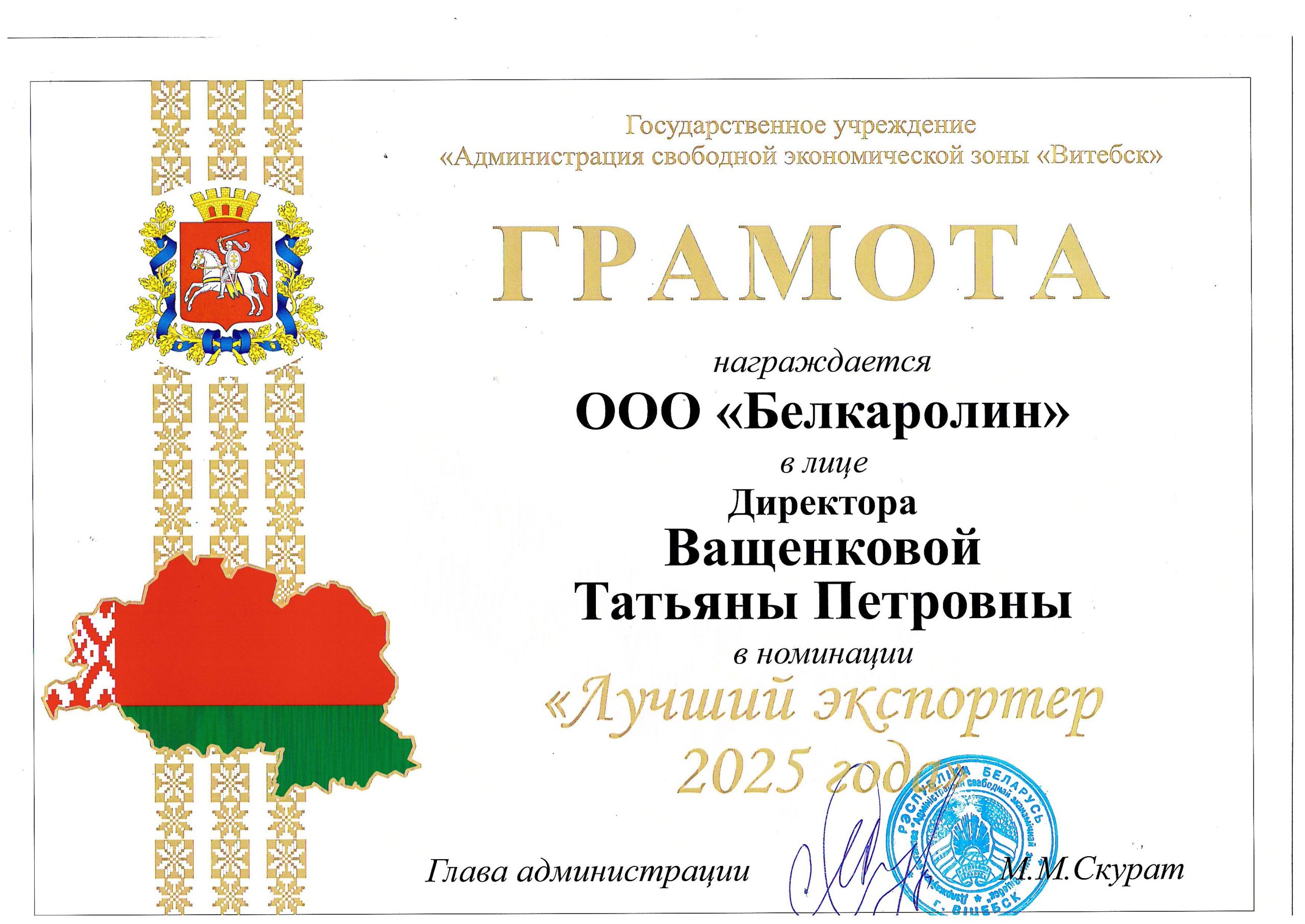«Белкаролин» благодарит администрацию СЭЗ «Витебск» и облисполком за высокую оценку нашего труда. Эта награда — заслуга всего коллектива, который ежедневно работает над качеством продукции и расширением географии поставок.